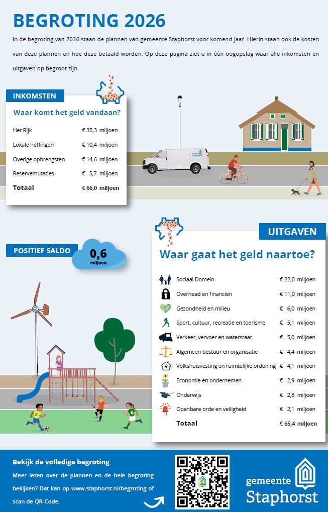 In dit hoofdstuk gaan we onder andere in op de gehanteerde uitgangspunten van deze begroting. Het structurele begrotingssaldo wordt gespecificeerd en er wordt een samenvatting gegeven van de grootste / belangrijkste mutaties in deze begroting en de opbouw van de begroting. Verder is een prognose opgenomen van de 'nieuwe' investeringen en de reserves voor de periode 2026 - 2029, waardoor u in deze samenvatting op hoofdlijnen een beeld hebt van de financiële positie van de gemeente Staphorst.