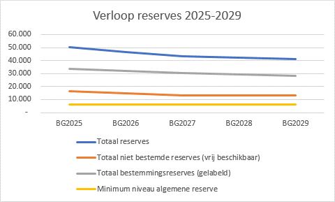 In bovenstaande grafiek ziet u het (geraamde) verloop van de reserves voor de periode 2025 t/m 2029. De vrij besteedbare reserve neemt naar verwachting af, van € 16,7 miljoen in 2025 naar € 13,0 miljoen in 2029. Dit is boven de grens van de minimum reserve van € 6,2 miljoen. De totale reserves nemen naar verwachting af, van € 50,2 miljoen in 2025 naar € 41,1 miljoen in 2029. Voor een uitgebreid reserveoverzicht wordt verwezen naar het 'Overzicht reserves- en voorzieningenpositie'.